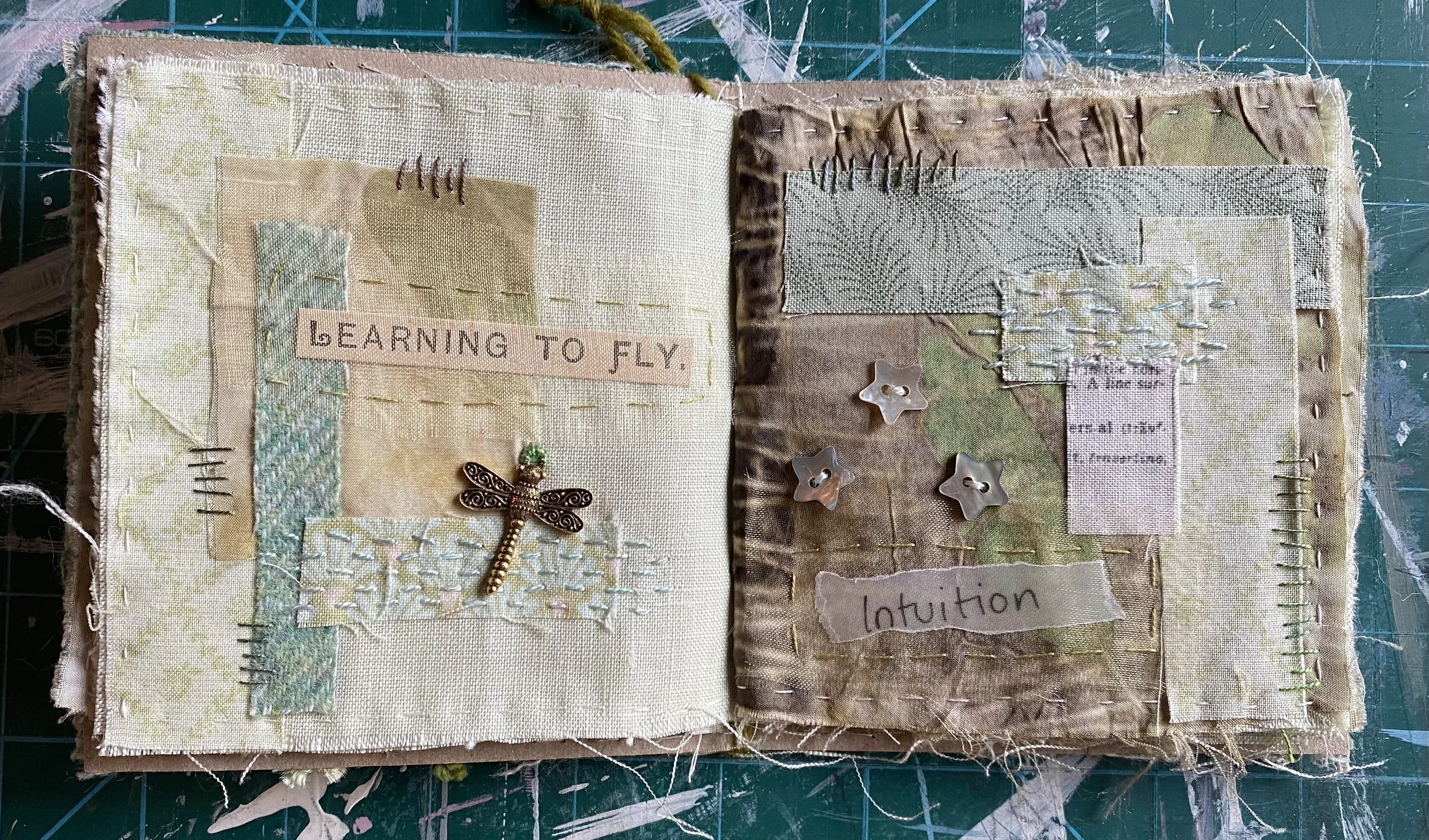 I chose to completely stitch my Truth journal. I used a lot of small scraps of patchwork fabric to create tiny collages which I stuck down and stitched into. I enjoyed making this journal and found it very meditative to work on.